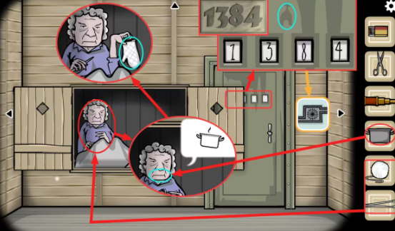客厅—大门视角:将(毛衣针)和(毛线)交给老婆婆;点击老婆婆让她织东西,她提出要喝热牛奶,将(有热牛奶的锅)里的牛奶交给老婆婆,她喝完后织出一只(烤箱手套);点击大门,密码上有个教堂的标志,将教堂处获得的数字“1384”输入密码装置,地下室大门被打开,获得成就(地下室)。