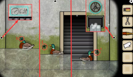 地下室—大门视角:左侧的装置视角里窗户上有个6:10的时间;将右侧闸门视角里的闸门打开,水位开始上升,控制鸭子吃掉墙上的三株水草(点击第一下鸭子开始往正前方游,第二下鸭子会暂停,第三下鸭子会往反方向游),获得(肥鸭子)。(这里提供大家一种简单的办法:闸门关闭后水位会下降,水位只要上升过一次后最低的水位只能降到可以让鸭子刚好能吃到最右边水草的位置;上升过水位后在关闭水闸将水位降到最低的情况下先控制鸭子吃掉最右边的水草,将水闸重新打开后回到大门视角,吃了一次水草鸭子会被重新刷新到左侧两株水草之间,这样操作起来会容易一些。)