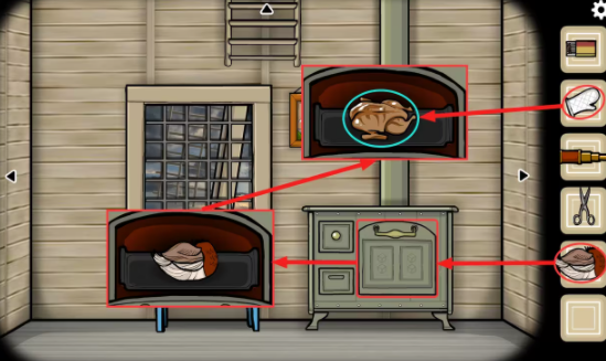 客厅—窗户视角:获得烤炉上的(盛有水的锅);将(木头)和(金牙)放入烤箱左上角的抽屉里,用(火柴)点燃抽屉里的木头后合上抽屉;拉开左下角的抽屉,高温使金牙融化变成了(液体黄金);将(液体黄金)倒入桌子上的钥匙模具里,关上再打开后获得(金钥匙);来到天花板视角,用(金钥匙)打开阁楼的门,获得成就(阁楼)。