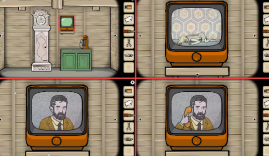 阁楼—落地钟视角:点击电视上的按钮,电视上出现了戴尔,他将(黑方块)和(白方块)放进了电视里,连续点击电视按钮后界面被蒙上了一层白色。