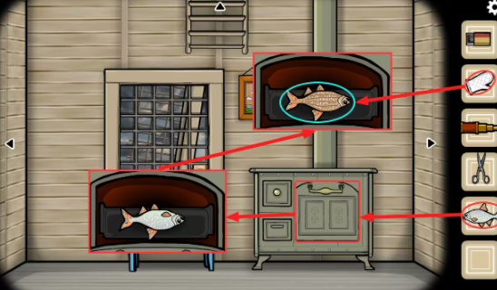 客厅—窗户视角:将(鱼)放入烤箱,关上再打开后变成了(烤鱼),带上(烤箱手套)将(烤鱼)拿出烤箱。
