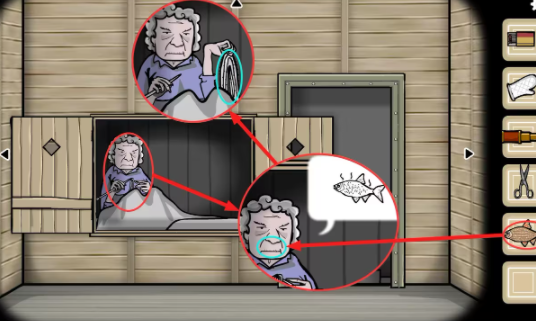 客厅—大门视角:点击老婆婆,最后老婆婆想吃烤鱼,将刚烤好的(烤鱼)交给老婆婆,老婆婆吃完后织出一捆(强韧的绳子)。