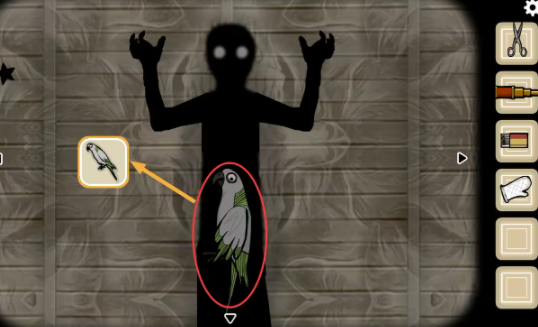 客厅—窗户视角:获得桌子边的(木头)和桌子上的(火柴);点击上方三角转换到天花板视角,用(火柴)烧掉蜘蛛网,获得(钥匙);墙上的挂画点击可以进入初始界面,解锁其他场景后可快速移动。