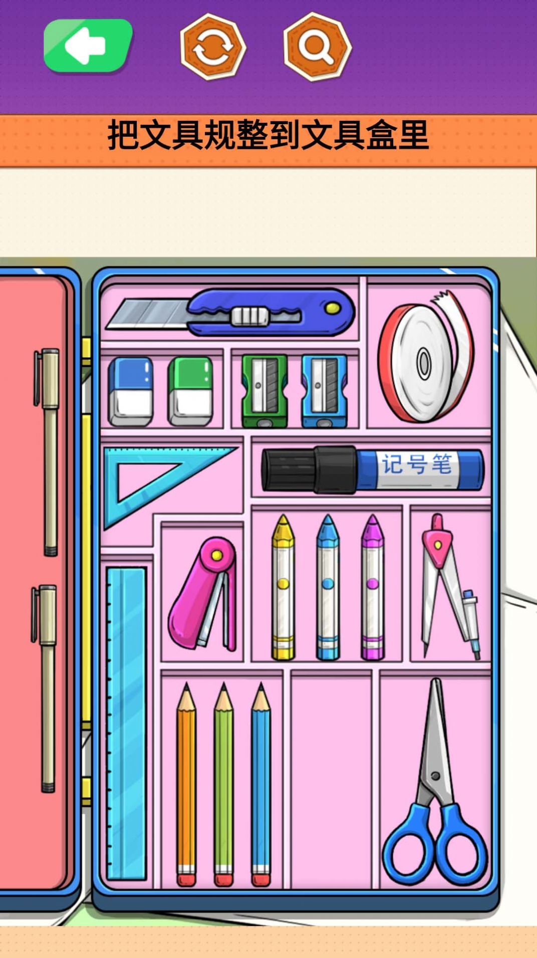 马克笔收纳达人是一款休闲闯关类型的游戏,玩家将在游戏之中对各种生活中的小谜题进行解谜。游戏之中有着非常丰富的马克笔,这些不同的笔会带给玩家不同的体验。游戏中有着非常多的工具,玩家可以使用盒子、衣架等等。游戏之中对于收纳方法和技巧也比较考验,玩家考验多加尝试。