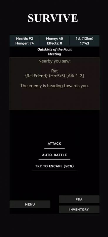 断裂带游戏官方版这是一款文字类休闲模拟游戏。在游戏中,玩家将处于一个混乱的世界之中,你需要搜寻赖以生存的食物与水源,收集武器装备来帮助自己。在游戏中你会面临许许多多的选择,不同的选择导向不同的答案,不断的在诸多选择之中选出你认为最合的选项来达成属于你的那个结局吧。