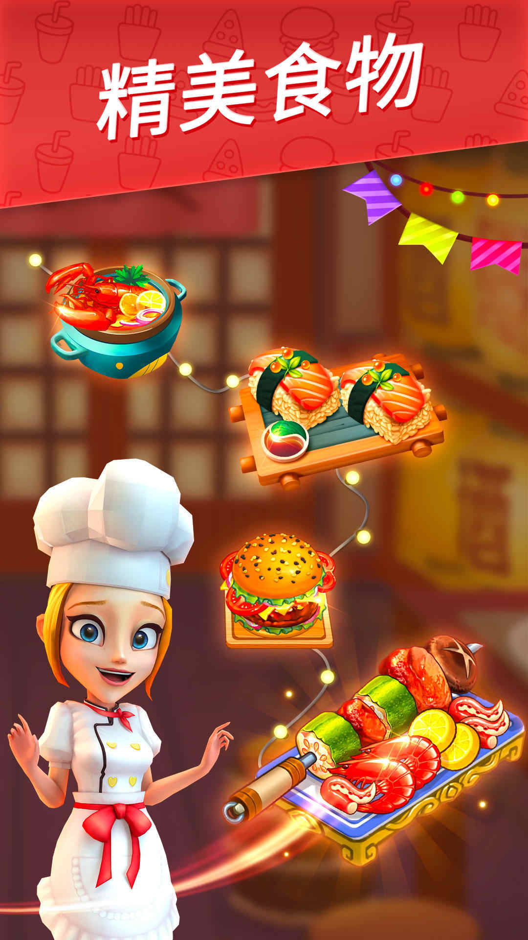 2、不断解锁新餐厅提升你的烹饪技能;闯过不同目标的关卡获得奖励来翻新和建设你的餐厅。