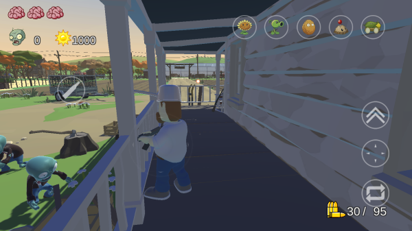 2、左上角的“大脑”是生命值,底部是目前已击杀的僵尸数量和阳光数,滑动右侧屏幕可以旋转视角,还有跳跃、瞄准以及换弹等快捷按钮。