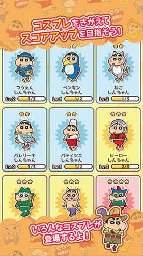 蜡笔小新跑酷是一款跑酷闯关类游戏,玩家在游戏中将会看到不同风格的蜡笔小新,它将作为自己的闯关角色,根据玩家的不同等级就可以解锁相应的蜡笔小新,玩法和地铁跑酷的玩法很相似,相信玩家很容易就能熟练操作。