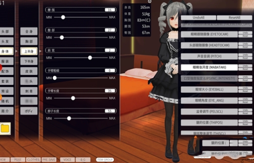 2、身形插件,捏人界面呼出,可解除原版滑动条限制、细调身体各结构、改变声音粗细等。