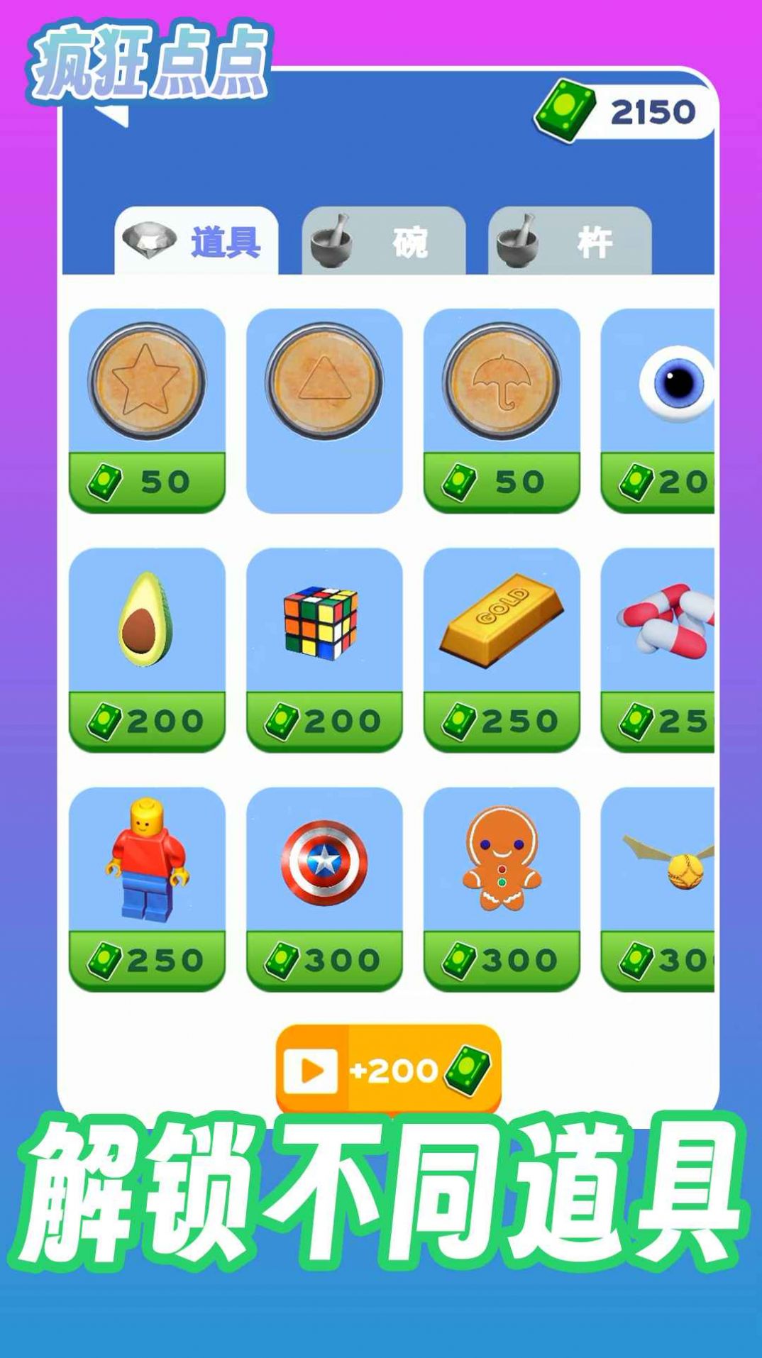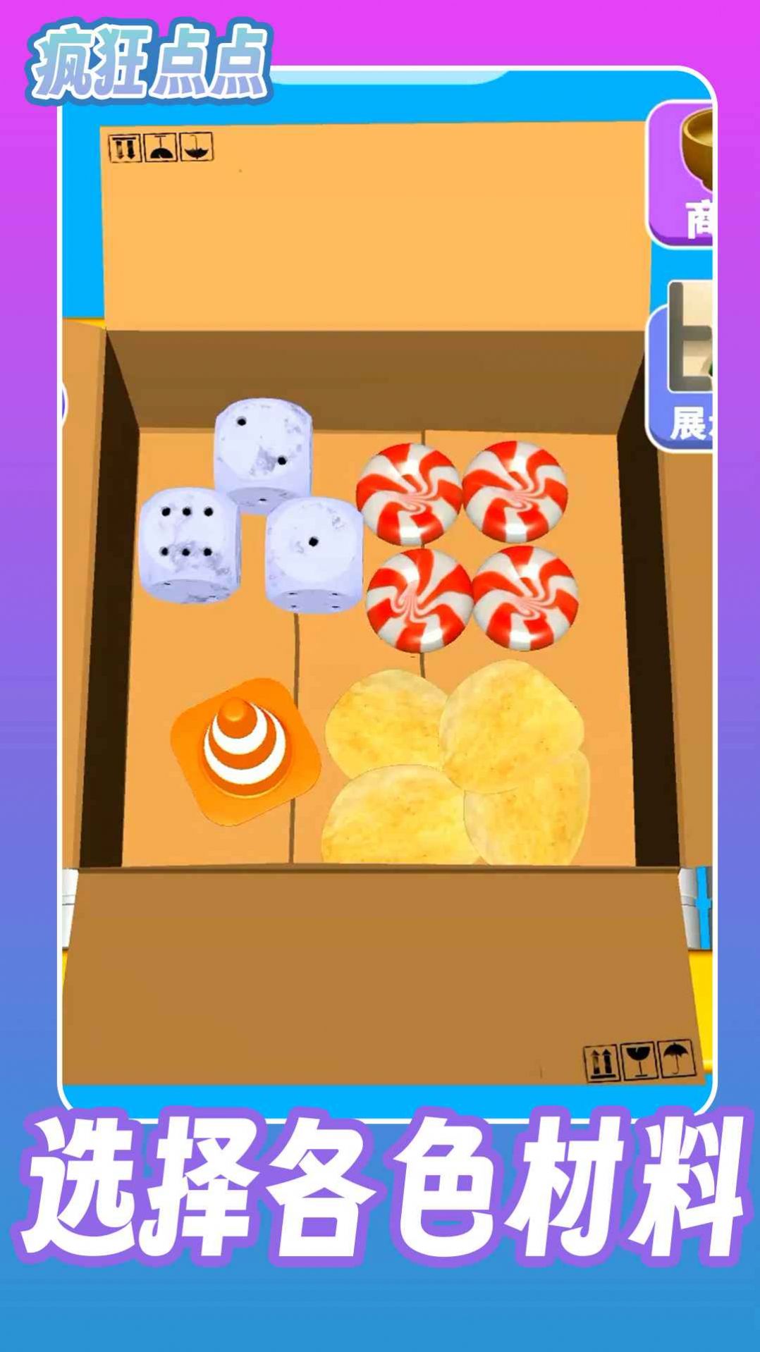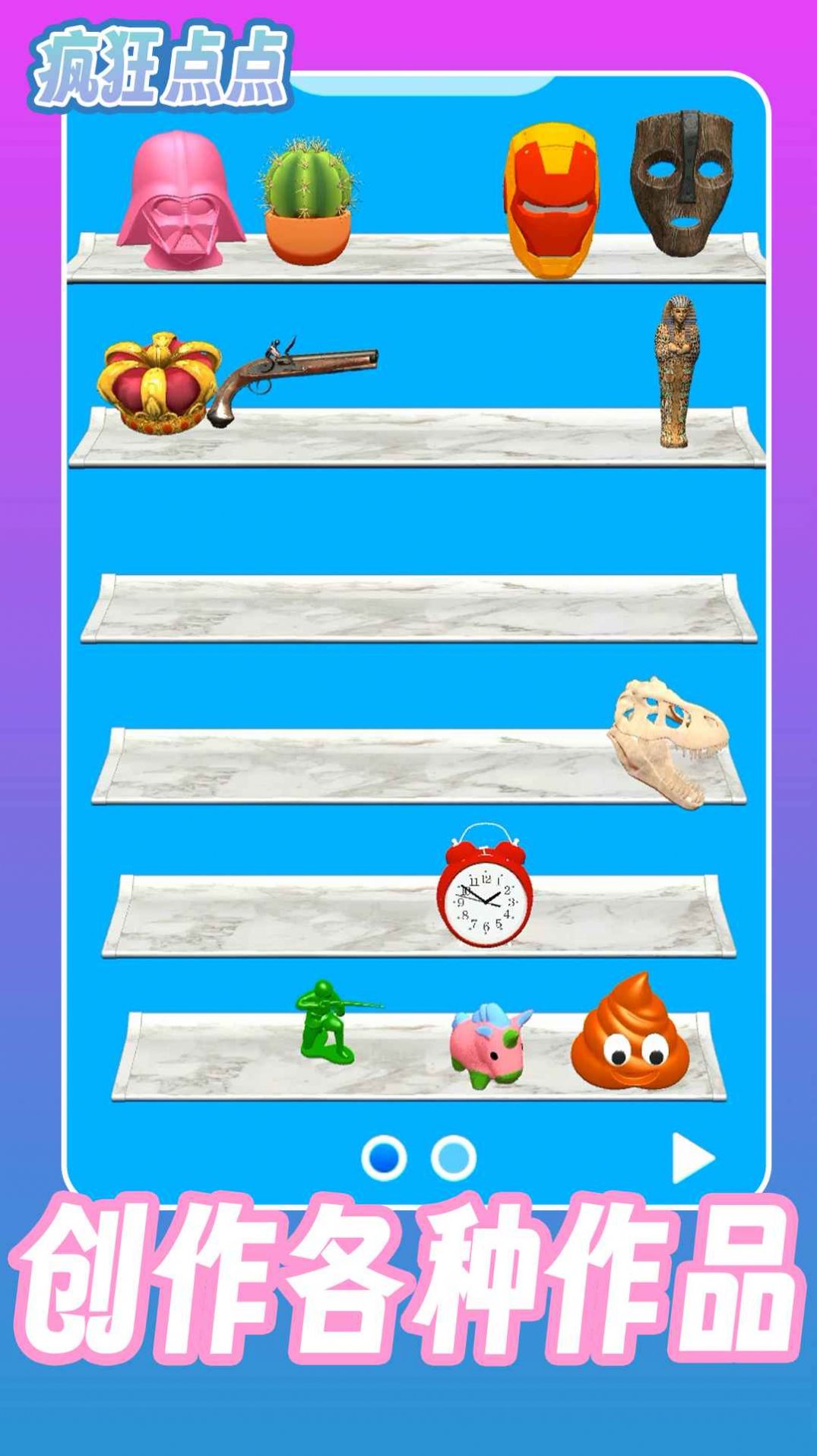 疯狂点点游戏是一款非常欢乐和充满挑战的点击闯关动作游戏。在游戏中,玩家需要通过点击屏幕来控制角色进行各种动作和挑战,以通过关卡并解锁新的内容和模式。游戏中有许多有趣的模式和玩法,例如点击移动的物体、点击出现的图标等等。每个模式都有不同的规则和挑战,玩家需要学习更多的技巧和策略来应对。