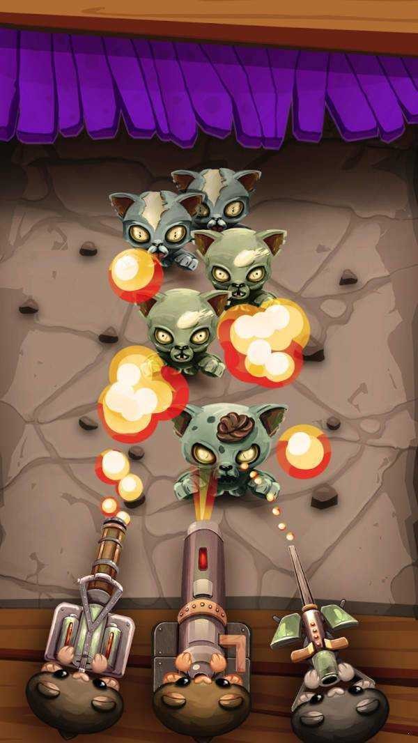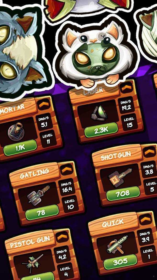 2、解锁和升级各种武器和炮台,增强它们的攻击力来面对越来越困难的关卡和那些变异的僵尸猫;