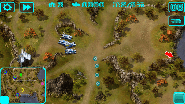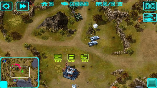 3、玩家通过兵营生产和升级坦克,利用不同的地形和阵型来调遣不同属性的坦克对其围剿。