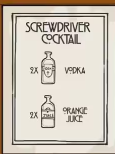 根据这个配方,调制一杯鸡尾酒,得到Harvey的伏特加橙汁鸡尾酒。给Bob喝,获得成就Harvey的伏特加橙汁鸡尾酒。他开始疯狂撞击自己的头,头破血流,用玻璃杯去接,得到血。再根据厕所门外的配方配置一杯鸡尾酒,得到血腥玛丽,获得成就血腥玛丽。