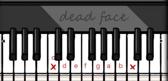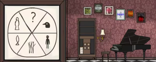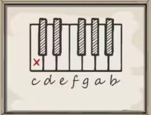 3、视角再往右,看到补光灯,把插头用螺丝刀接上,插上插座,灯亮了。桌子上绣湖剧场演出名单,观察墙上的挂画,可以得到一张酒的配方和钢琴键对应的符号,根据这个符号去弹奏钢琴,先弹“dead face”对应的键,见下图,左边琴键里伸出来一直手,点击它,手开始弹琴,在右侧复刻它的弹奏,最后得到一把钥匙。