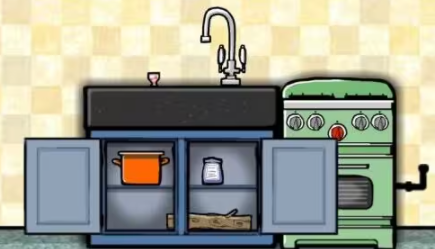 拨动左边的按钮,开灯,望向天花板,得到灯里的照片碎片。来到水池,打开下面的柜门,得到空锅、鸟食和木头。