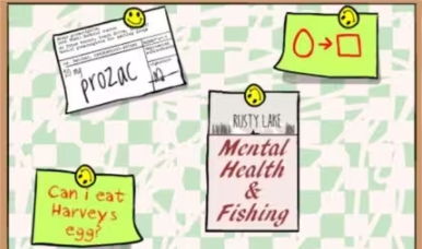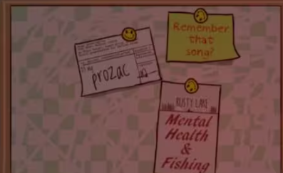 另外两张是治疗忧郁症的百忧解和绣湖传单:精神健康及钓鱼中心:说明Laura得了忧郁症。