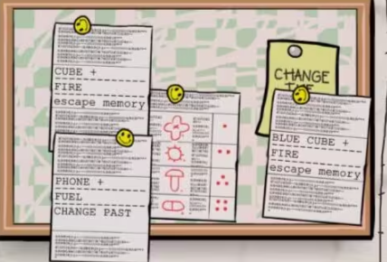 1、查看展示板,绿色字条写着 “改变过去”,另外三张纸写着“方块+火=逃脱记忆,电话+燃料=改变过去,蓝方块+火=逃脱记忆”,以及中间纸上的图案提示。