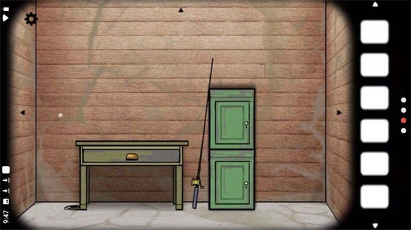 6.回到有桌子的房间,继续用撬棍打开墙上的木板拿到钥匙。回到右上角有壁橱的房间,用钥匙打开壁橱,得到模具。回到拿着鱼竿的房间,按照顺序安装鱼竿、鱼线、鱼钩。找到这些物品后,首先将虫子放在钓鱼竿上并点击它。用鱼竿捉虾。