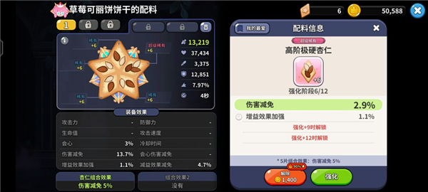 3、配料选择:配料其实可以理解为○神里面的圣遗物,这样方便不了解这款游戏的萌新玩家们快速上手。和圣遗物一样配料也有很多种但是前期有用的配料只有减伤、攻击力、冷却。而且如果没有获取到超级稀有配料(金色圣遗物)则不建议用果核升级(金币稀缺)。