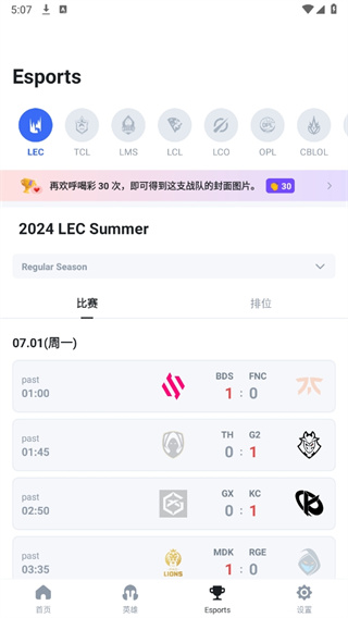 5、另外,比赛栏目可以看LEC/TCL/LMS/LCL/LCO/OPL/CBLOL等不同的战绩。