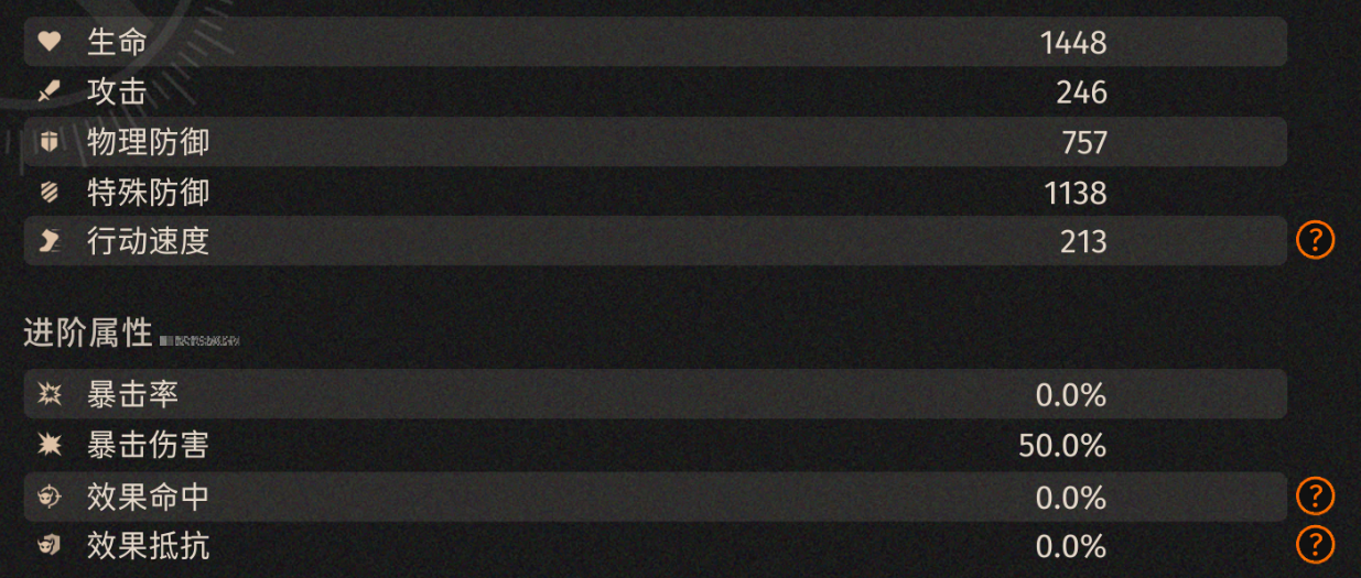 算是经典的回合制二游养成,非常的好理解,养成起来也不算困难,面板跟星铁完全一模一样,效果命中可以增加技能上dbuff的概率,效果抵抗可以减少敌人对你上dbuff的概率。速度则是影响出手顺序,这东西在回合制里面非常重要,唯一蛋疼的是角色的初始暴击率居然是0.。。