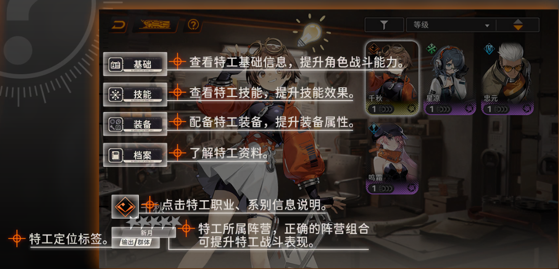 可以看到,角色定位可以分为五种类型,突击型可以理解为上dbuff的角色,强攻型可以理解为单体c,特攻型可以理解为群体c,辅助型是增伤和辅助,防护型就是坦克。