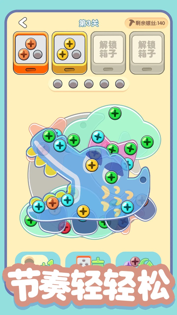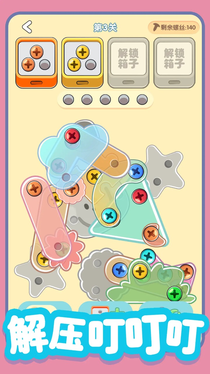 这是一款将螺丝全拧掉的游戏!它不仅仅是一款简单的消除游戏,你需要快速准确地拆掉螺丝,将它们放入同颜色的箱子里。随着每一个螺丝的消失,彩色玻璃会缓缓滑落,快来螺丝全拧掉,释放你的压力,展现你的技巧,成为真正的螺丝消除大师吧!