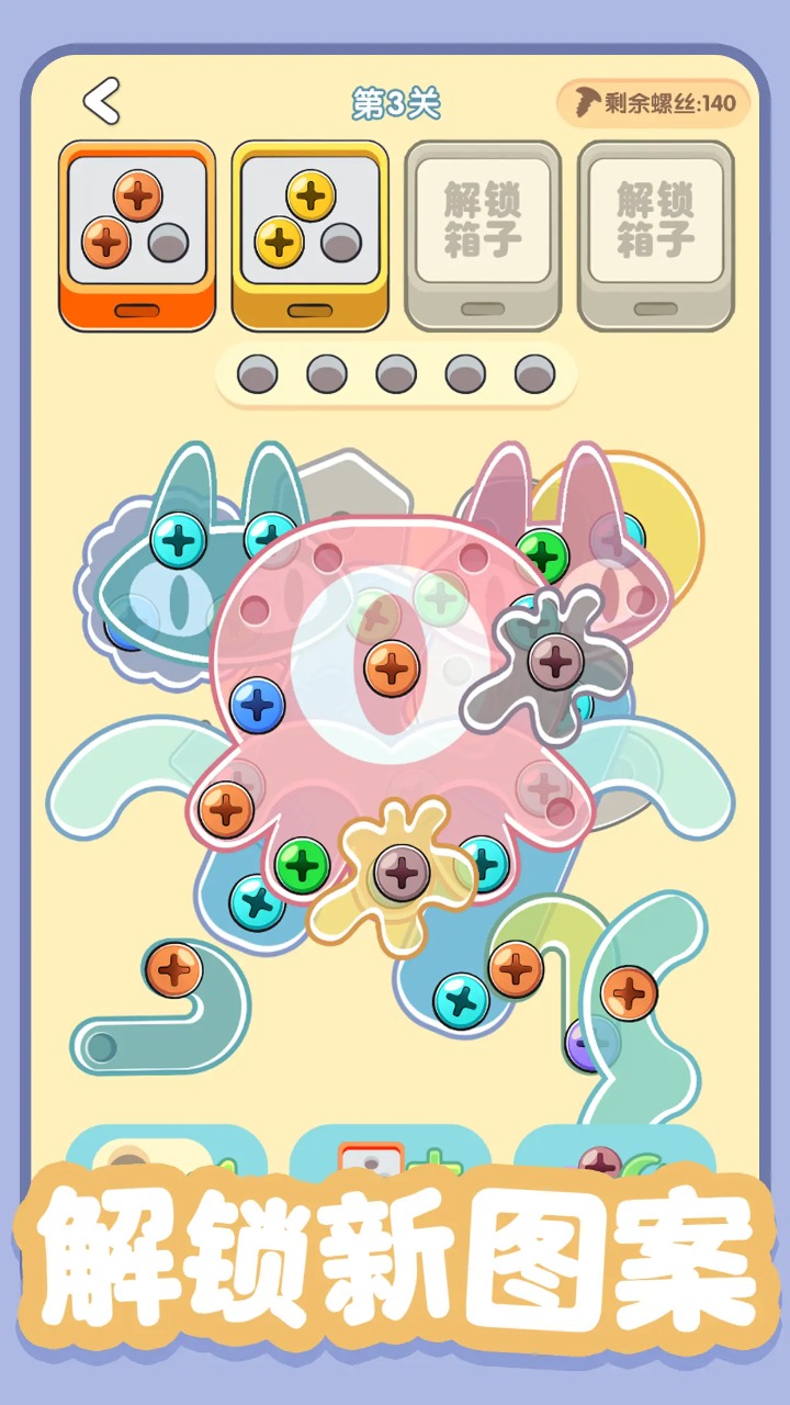 随着游戏的进行,螺丝的数量、类型和颜色逐渐增加,拧开螺丝所需的速度和准确性也逐渐增加。