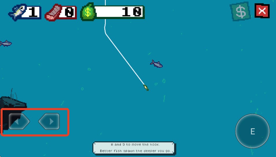 1、从画面最左侧出发,角色可开始垂钓,钓线会自动向下延伸,准备捕捉水中的鱼类。