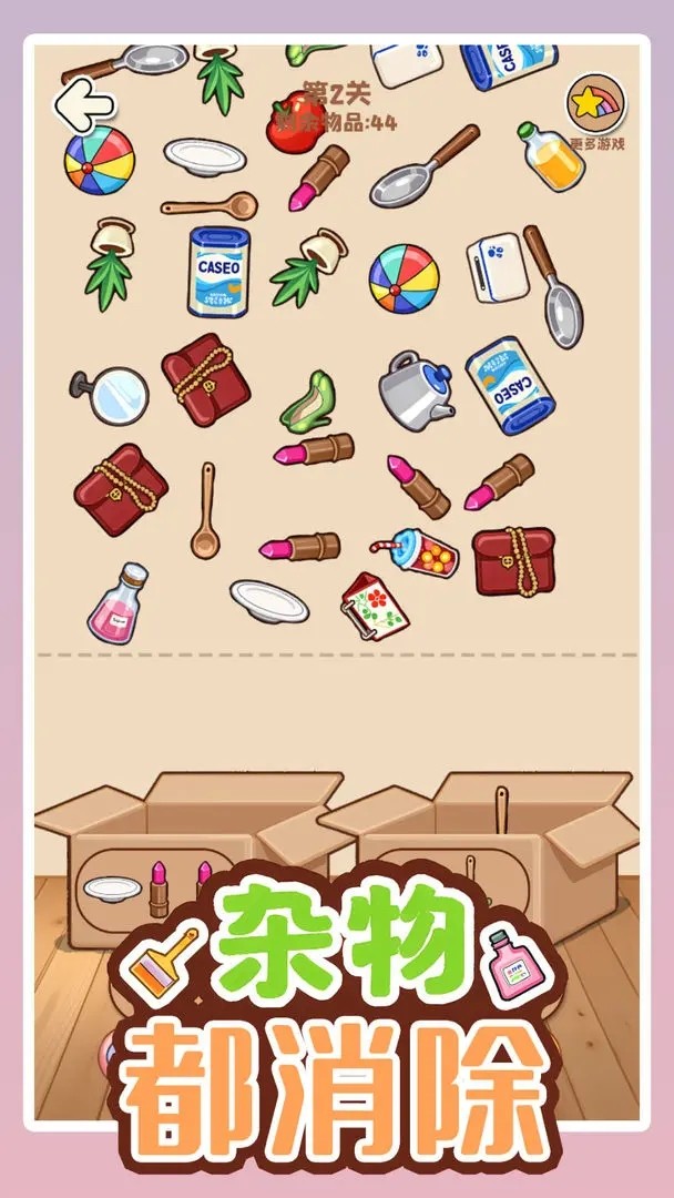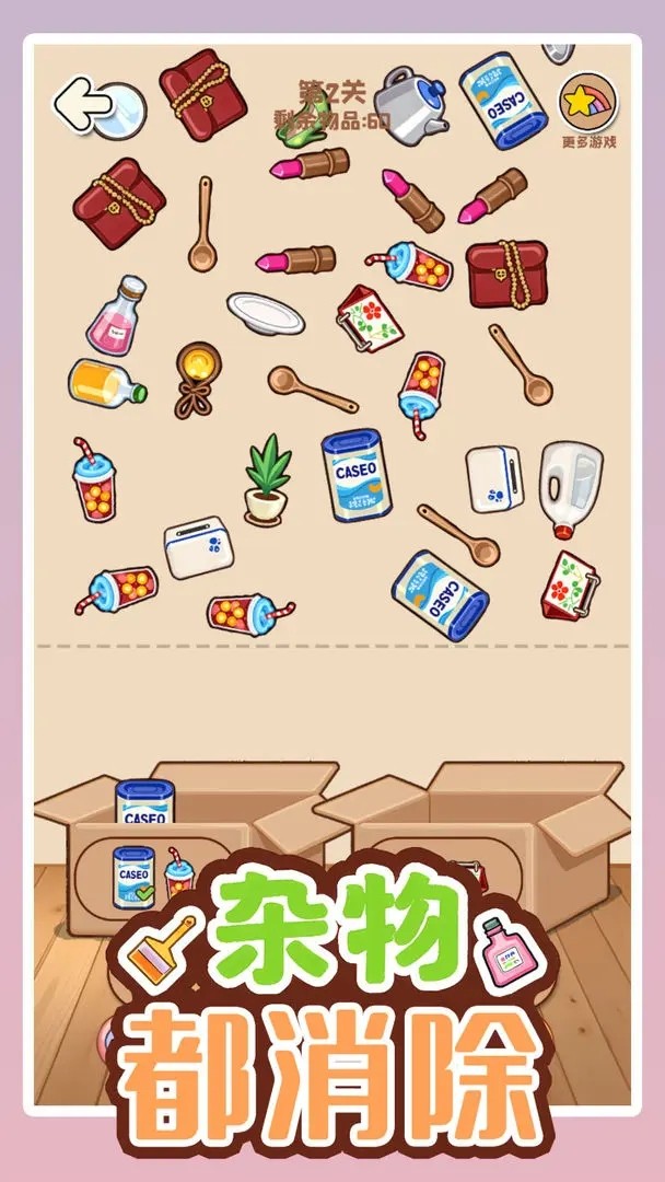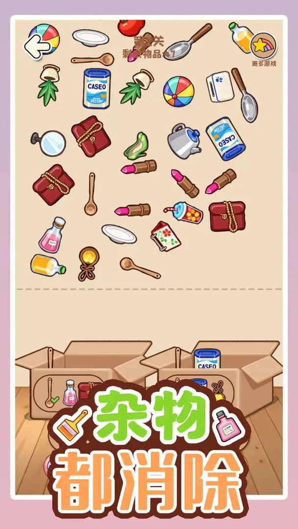 杂物都消除是一款非常有趣的休闲游戏,主打的就是消除物品整理房间的玩法,在这款游戏之中玩家扮演的是房间的主人,需要将杂乱的物品都装到对应的箱子里面,该游戏的休闲氛围非常的有趣快且轻快,加入游戏一起整理房间吧!