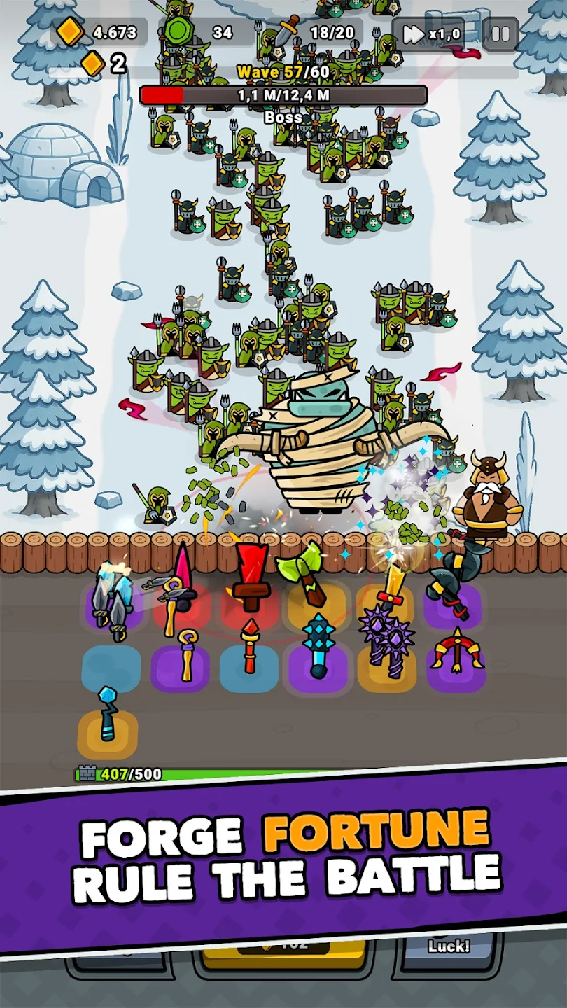 - 你可以靠运气锻造强大的剑,合并强大的武器,并准备好在一波又一波攻击你的塔的敌人中生存下来。