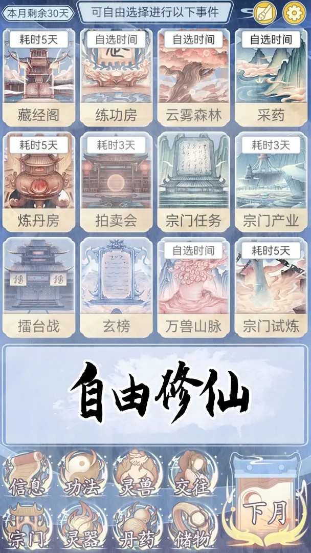1、游戏中提供了多种随机事件,如宗门任务、万兽山脉、云雾森林、藏经阁等等,每个任务耗时时间不同。