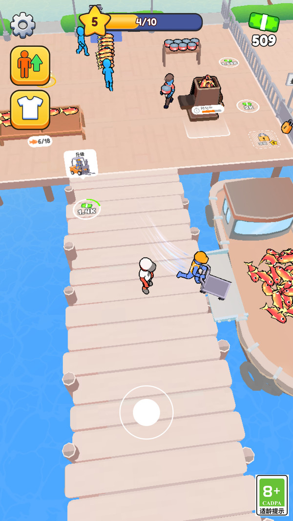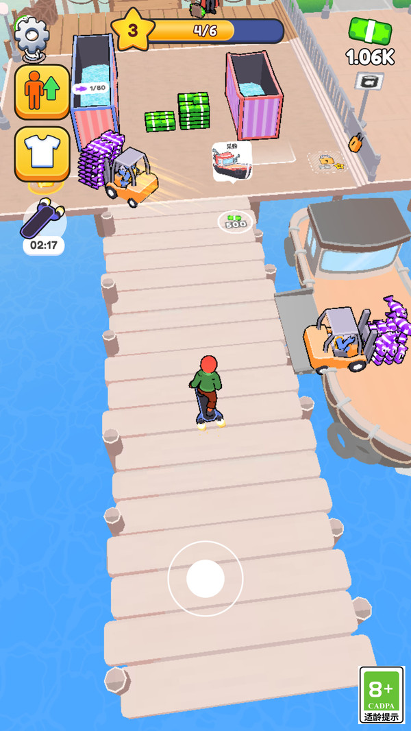 玩家通过虚拟摇杆控制角色管理一个港口,收集资源,进行商品生产和贸易,通过升级各种设施,获取更多的游戏资源来解锁更多的贸易港口。逐步扩大港口规模,提升效率,打造繁荣的小镇,成为海洋贸易的中心。