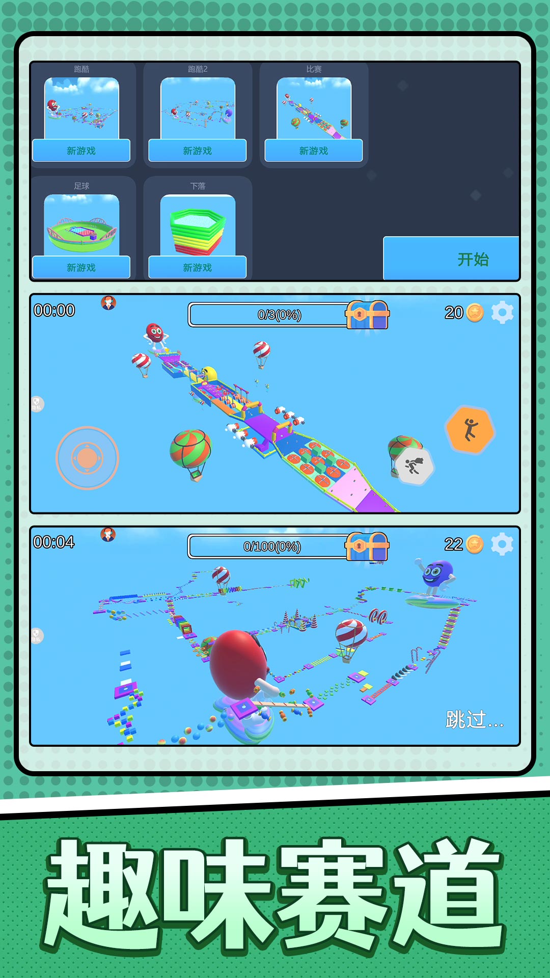 1、蓝天白云搭配五彩赛道,融入萌趣角色与奇幻元素,视觉风格活泼。