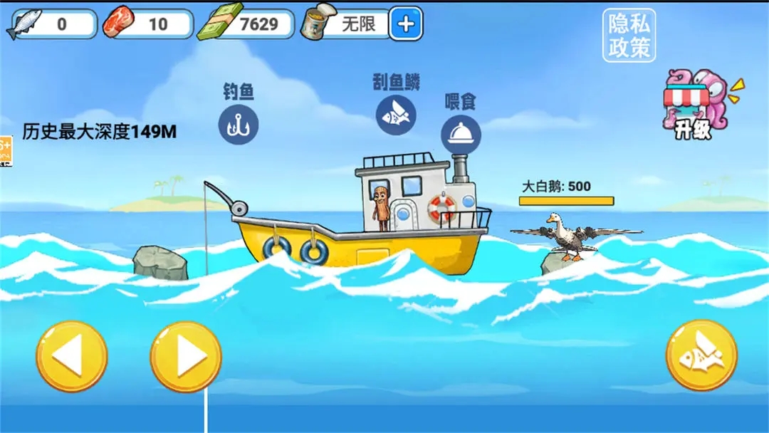 把刮完鱼鳞处理干净的鱼喂给小船右侧饥肠辘辘的顾客(乌龟),它们吃饱后会支付金币给玩家。玩家可以使用这些金币在商店中购买和升级工具,如刀、钓鱼线和钩子等,以提升钓鱼效率和刮鱼鳞的速度,进而更好地经营海上餐厅,吸引更多顾客。