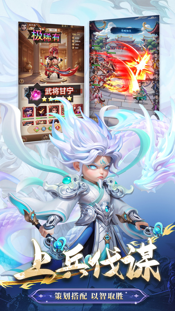 采用Q版古风画面,场景涵盖城池、荒漠、雪山等,武将立绘精致,技能特效华丽震撼。竖版视角设计,单手即可流畅操作,兼顾策略深度与便捷性。