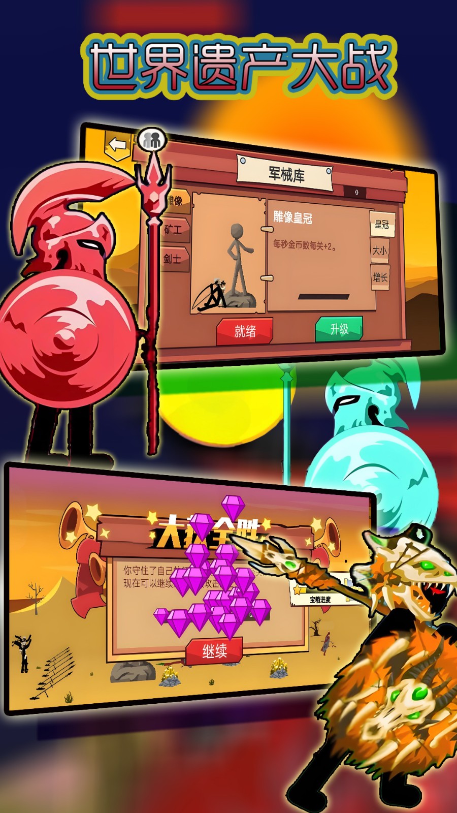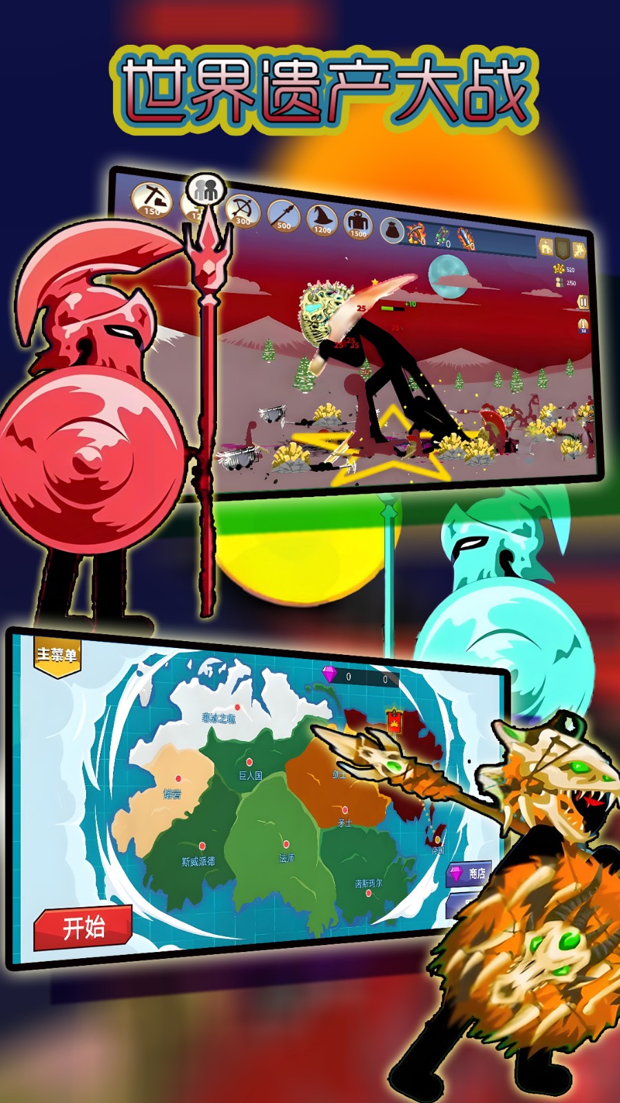 世界遗产大战是一款以火柴人军团为核心玩法的策略战争手游。玩家将置身于架空历史中的文明冲突时代,指挥由剑士、弓箭手、法师等特色兵种组成的军队,通过战术搭配与资源管理,在攻城略地中争夺世界遗产的归属权。游戏以诙谐的火柴人画风为表,内核却融合了深度策略与实时战斗机制,开创了轻量化战争模拟的新玩法。
