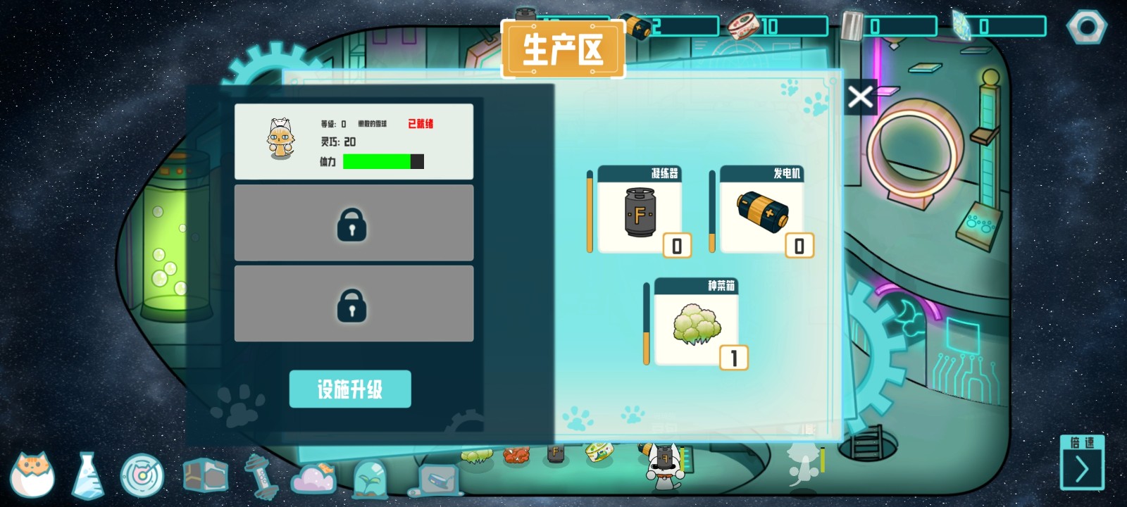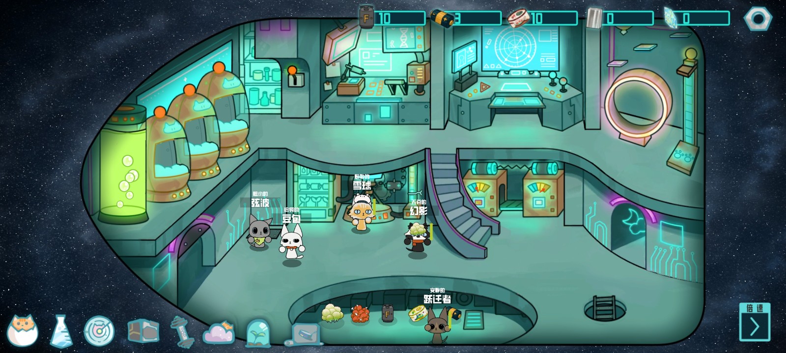 1、太空船经营:自定义布置猫窝、武器工坊等设施,管理燃料与食物资源,升级飞船能力以探索更远星系。