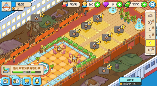 3、自由规划游艇内部布局,根据等级解锁餐饮客舱等设施满足游客多样化需求。