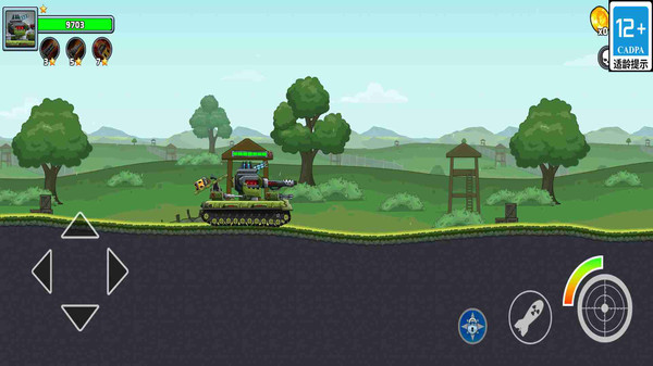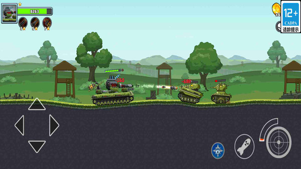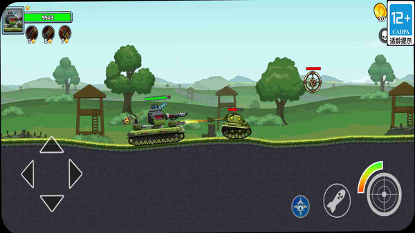 1、通过虚拟摇杆控制坦克的移动方向,点击屏幕上的主炮按钮发射主炮,点击机枪按钮进行机枪扫射;