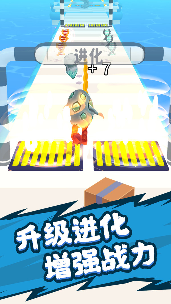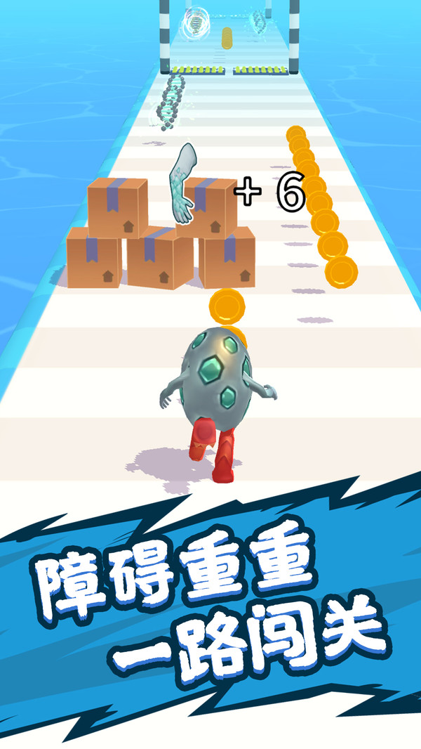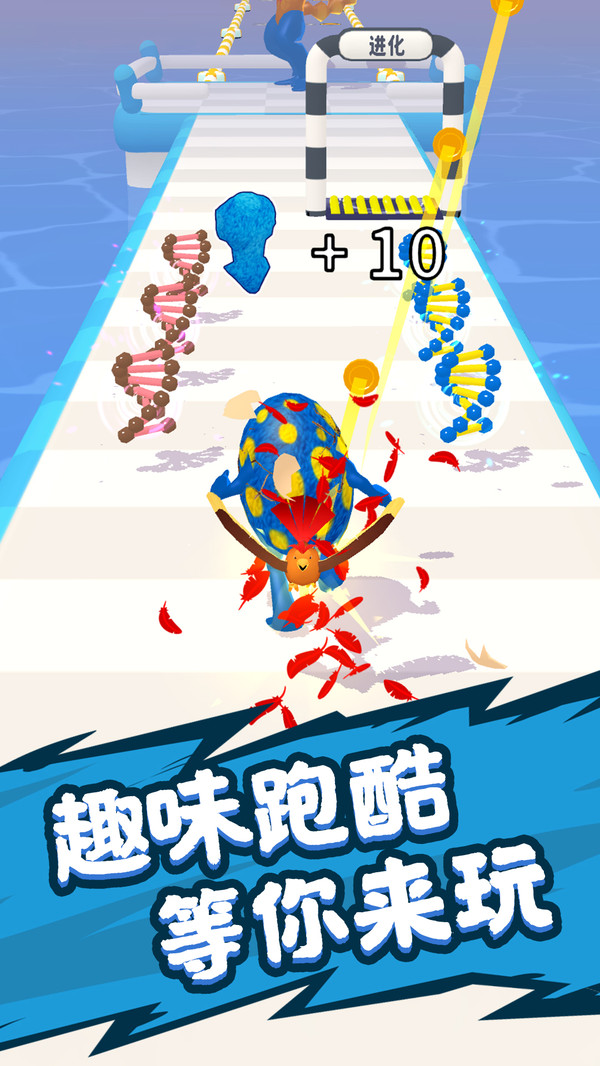 1、玩家控制一颗蛋一路躲避障碍,收集DNA,兑换成萌兽能力,强化自己的身躯。