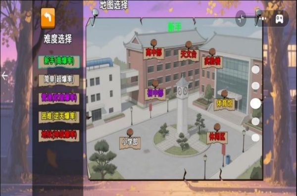 1、进入游戏后,先选择难度与地图,新手建议从高爆率的新手难度入手,熟悉小学部等简单地图的资源分布。