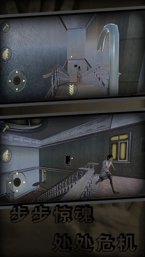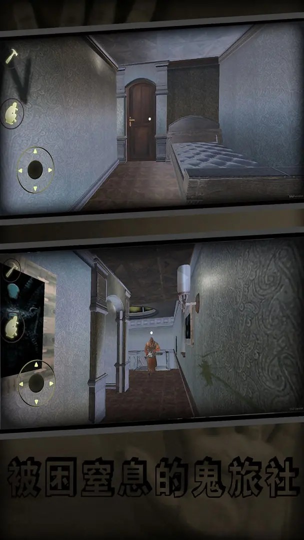1、游戏以第一人称视角展开,玩家置身于一座阴森诡异的旅社内部,整体环境昏暗压抑,通过虚拟摇杆控制角色移动,增强沉浸式体验。