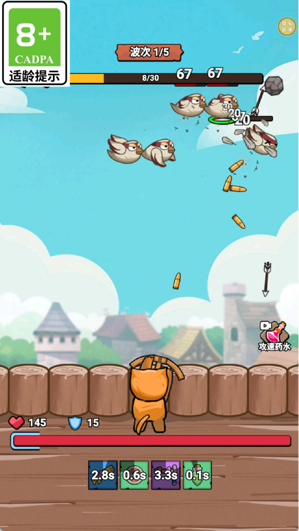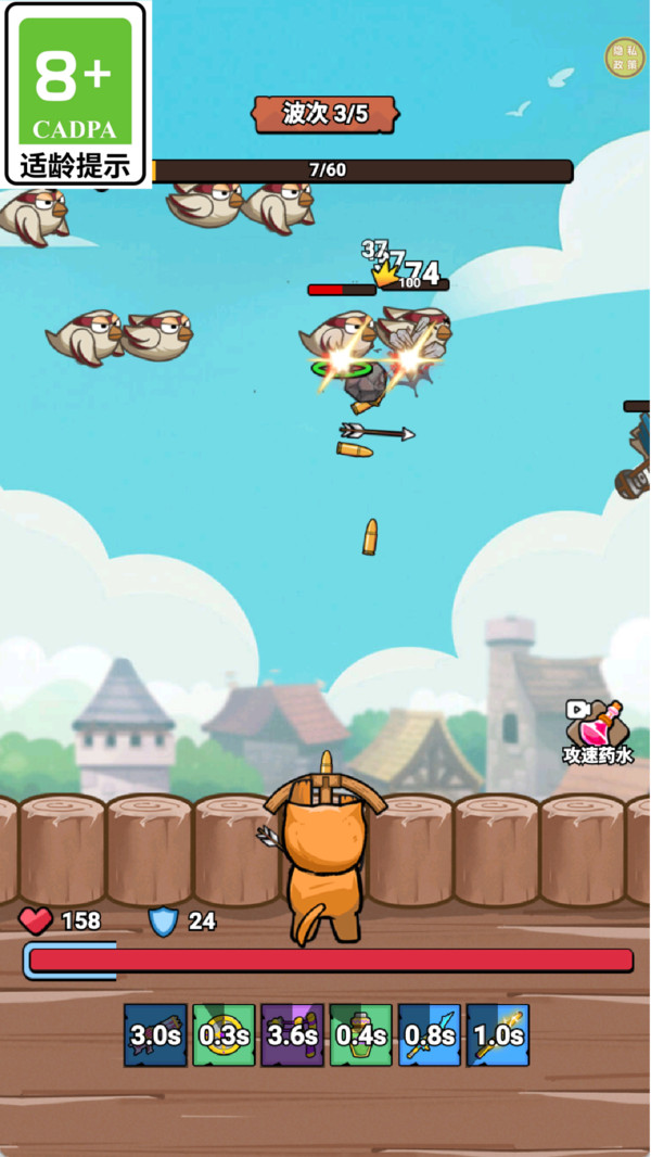 城堡突击战是一款治愈系塔防游戏中,玩家将化身猫咪指挥官,带领毛茸茸的军团对抗从天而降的机械鸟群!通过滑动屏幕调配炮台,用肉垫发射激光鱼骨,守护被彩虹色云朵笼罩的猫岛家园。每波进攻后可用收集的毛线球升级城墙,解锁会喵喵叫的超级武器!城堡突击战用治愈的风格打造无尽的刺激战斗!
