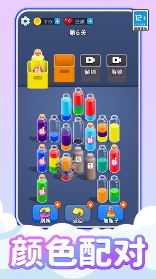 3、配备 “加瓶子”“玻璃锤” 等辅助功能,在遇到排序困境时提供解决方案,帮助你轻松的过关。