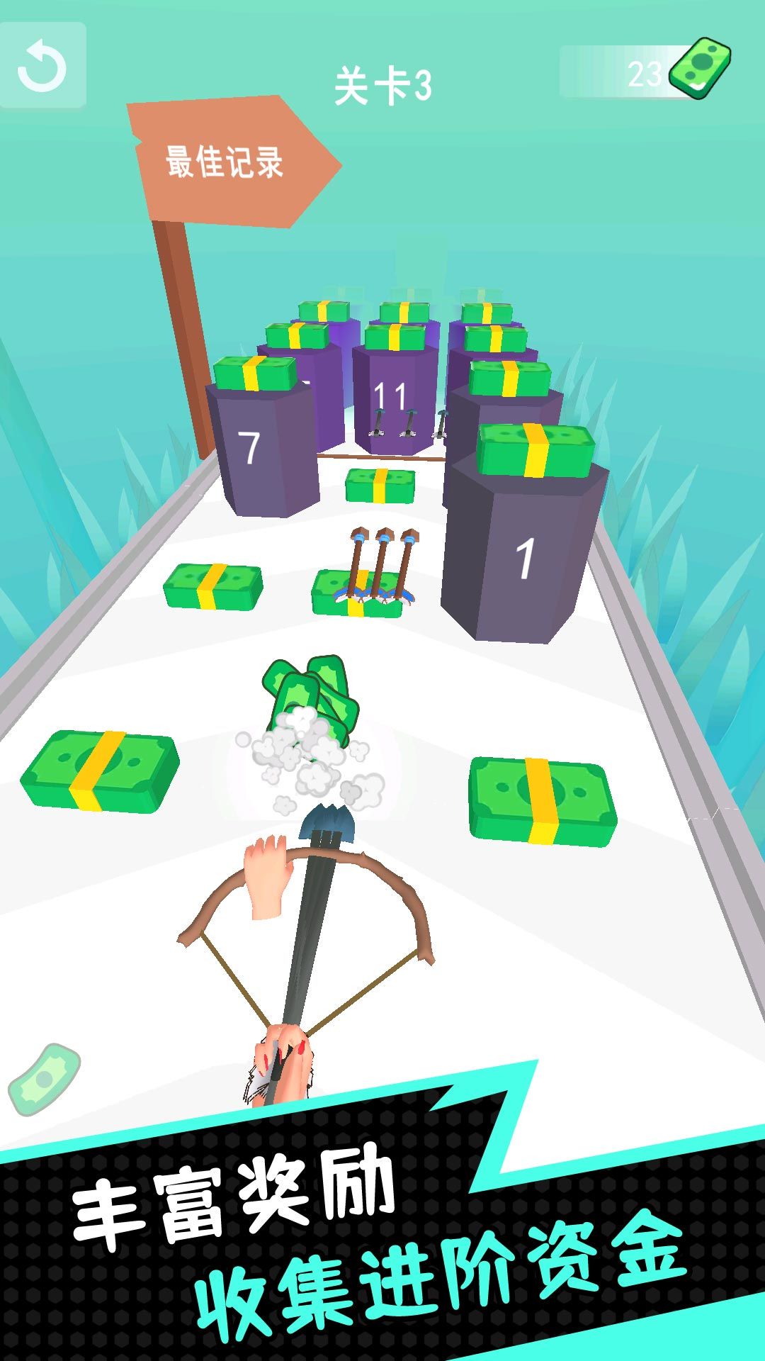 2、奖励体系与闯关深度绑定,通关、刷新最佳记录均可获取进阶资金,用于解锁新弓箭与强化属性,激励反复挑战提升实力。