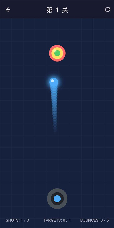 1、拖动瞄准,松手发射,让小球在墙壁间反弹,击中所有目标。