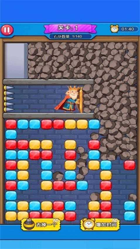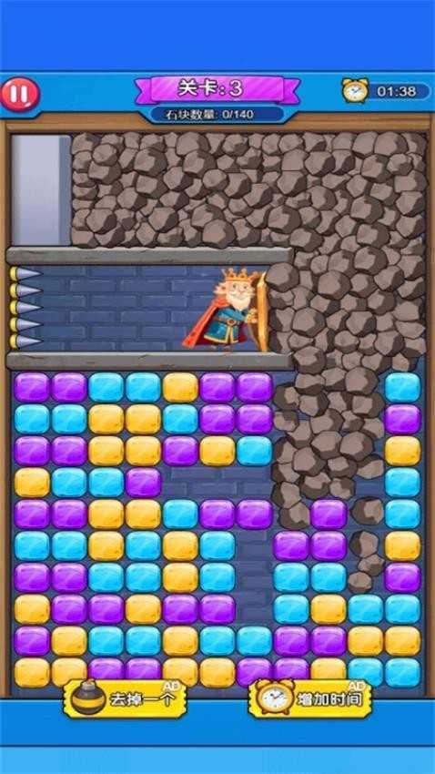 趣味性十足的休闲消除游戏。它巧妙融合了经典三消玩法与密室逃脱题材,能为广大玩家带来充满惊喜的游戏体验。游玩过程中,需留意国王的位置及周边各类危险物品,同时可在下方查看不同类型的钻石——找到相同钻石即可进行消除,不过要注意需在指定位置消除,才能清除其他危险物品并达成目标。各关卡难度梯度明显,较难的关卡需要反复尝试才能通过,快来展现你的超强实力吧!若你也对这款游戏感兴趣,不妨立即体验一番!