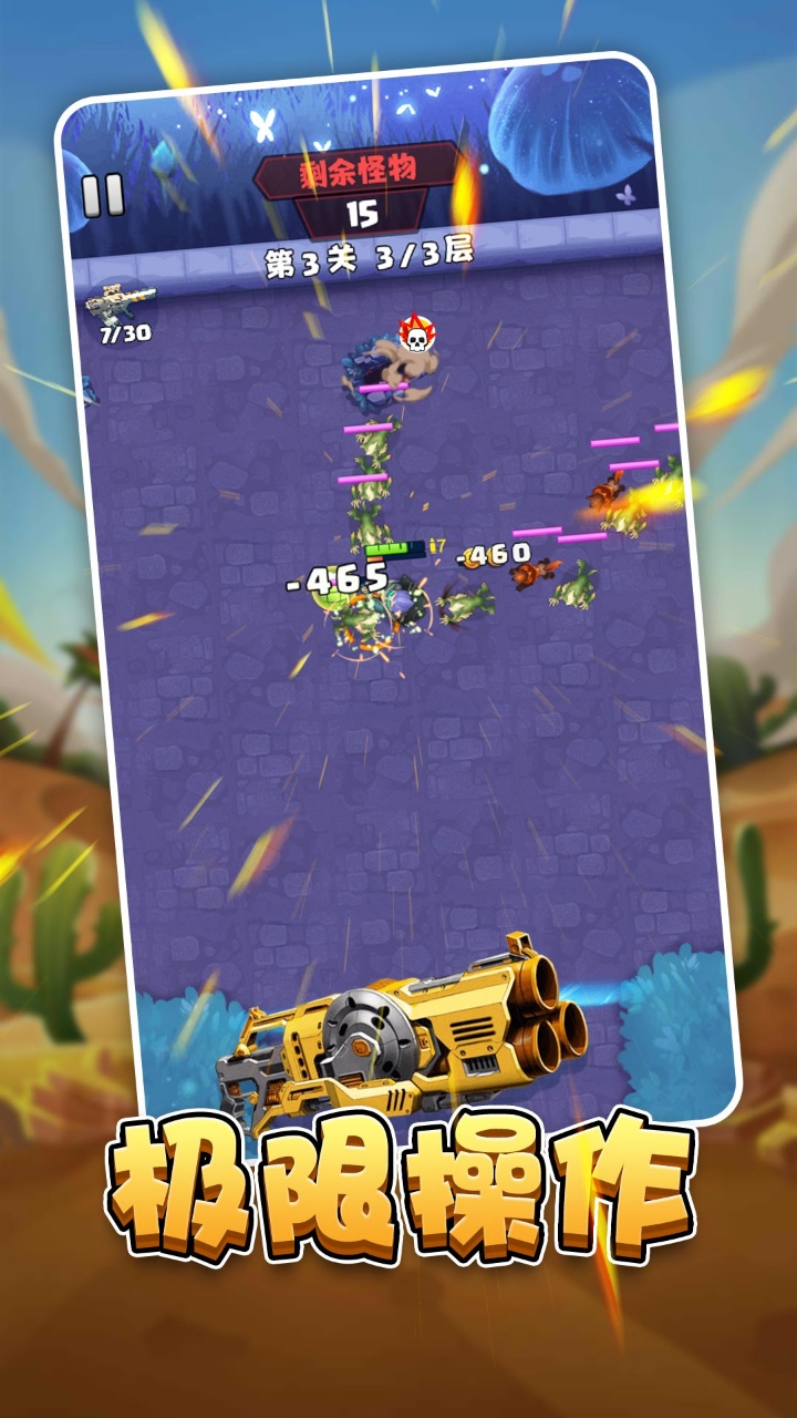 2、通过击杀怪物获取经验升级,每次升级可从3个技能中选择强化,合理搭配技能组合形成独特的战斗风格。