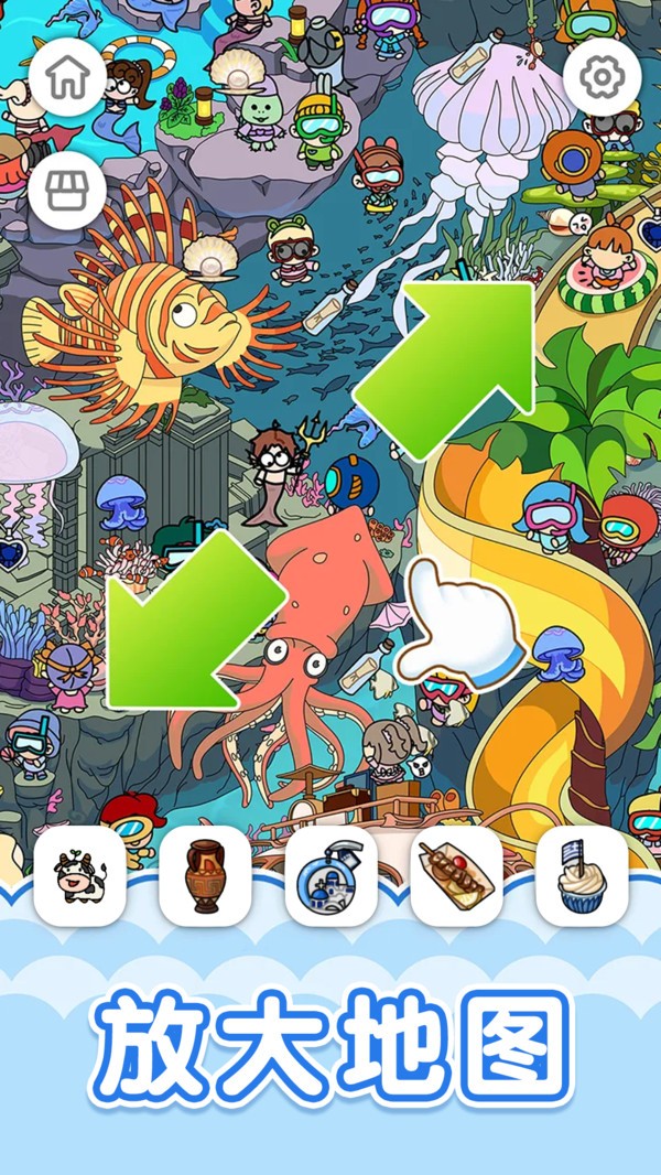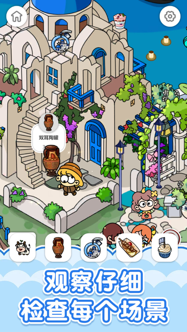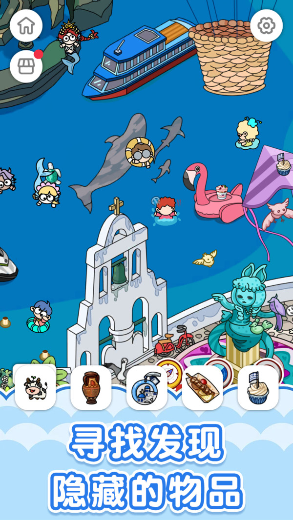 1、从散乱的物品中找到自己需要的,进行归类,自由寻找,画面轻松,给玩家放松的体验。